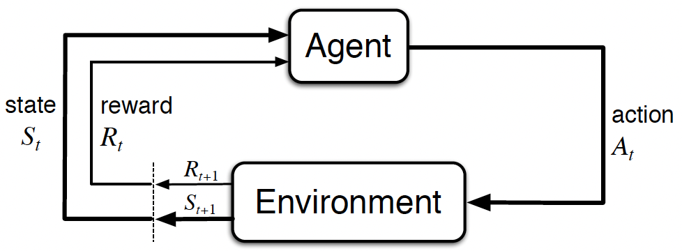 At each time step (\(t\)), the agent takes an action (\(A_t\)) in the environment, leading the environment to transition to a new state (\(S_{t+1}\)). The environment then emits a scalar reward (\(R_{t+1}\)), which the agent receives as given. The agent’s objective is to choose actions over time so as to maximize the cumulative reward it receives in the long run.